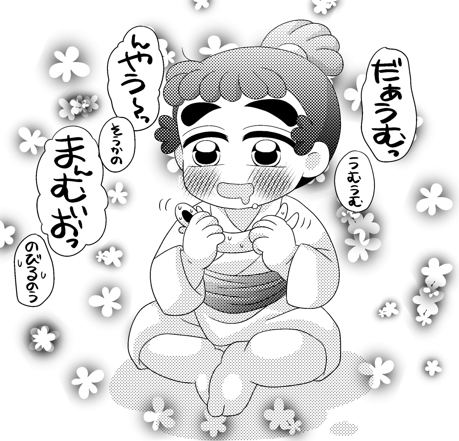 落書き、 これは、よくしゃべるベビ勘ちゃん。…WITH、うっかり巻き込まれ父(目玉)いや、何持たせよう…?って考えた時、うどん…いやうどんて(笑)では…何を…?え…ってなって、急遽、手伝ってもらいました(笑)君も、赤子はむちむちであれ教に入らないか?